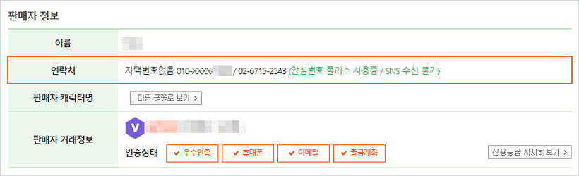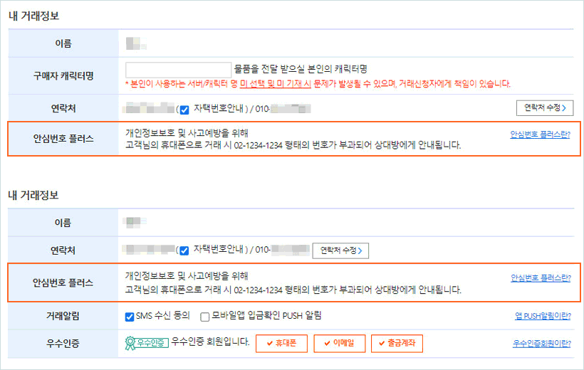하나. 판매등록/구매신청 시 안심번호 서비스를 이용하실 수 있습니다.