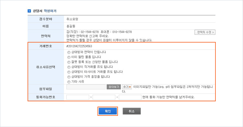 거래취소 물품의 상담정보를 입력 하신 후 [확인] 버튼을 누르시면 취소접수가 완료됩니다.