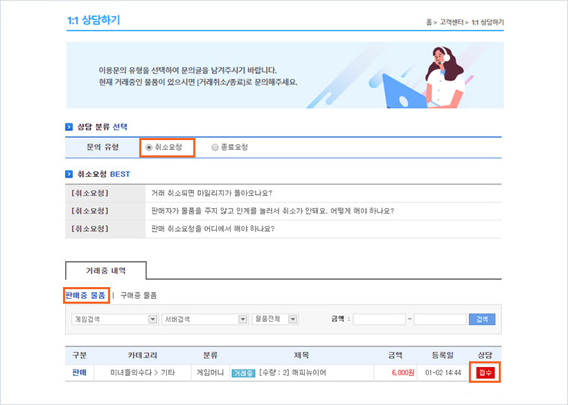 하나. 고객센터 > 1:1상담하기 > [거래취소/종료] 에서 ‘취소요청’ 선택 후 판매중인 물품에서 취소하실 물품의 [접수하기] 를 클릭 합니다.