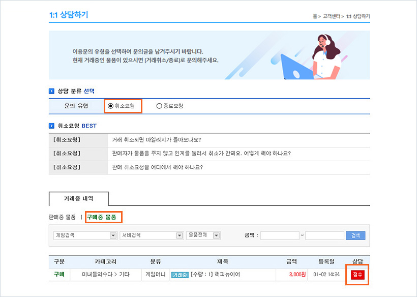 하나. 고객센터>1:1상담하기> 거래취소/종료요청에서 ‘취소요청’ 선택하신 후 구매중인 물품에서 취소할 물품의 [접수] 버튼을 클릭 합니다.