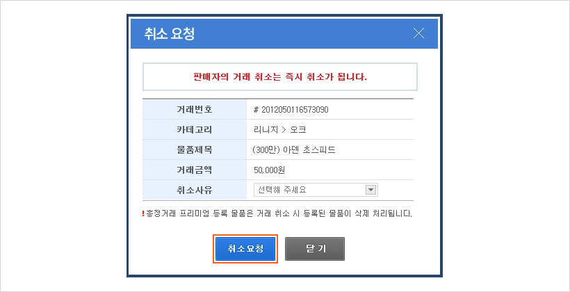 둘. 취소 요청 창에서 취소사유를 선택하신 후 [취소요청] 버튼을 클릭하면 거래는 즉시 취소됩니다.