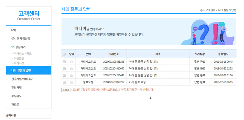 현재 거래중, 거래종료/취소된 물품의 거래사고로 인한 사고신고 시, 관리자가 신속하게 처리해 드리고 있습니다.