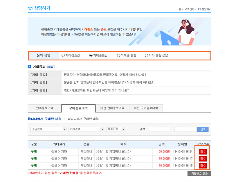 하나. 고객센터 > 1:1상담하기 > 거래사고에서 유형 선택하신 후 문제가 발생된 물품의 [접수하기] 버튼을 클릭 합니다.