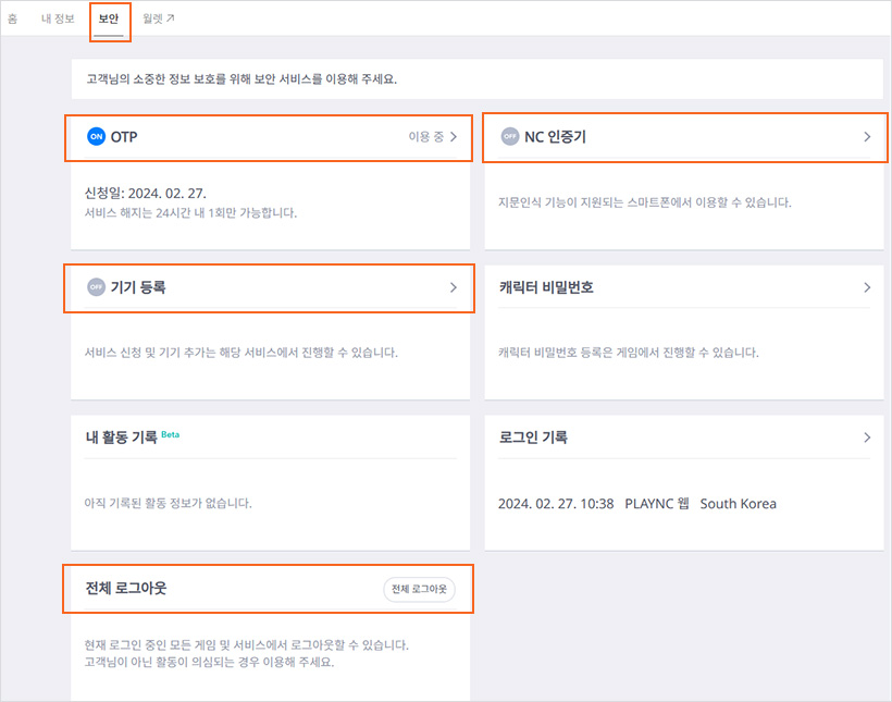 넷. 보안 탭에서 현재 등록되어 있는 보안 서비스를 확인하고, 등록되어 있는 보안 서비스를 해지한 후 전체 로그아웃 서비스를 이용하여 로그아웃을 진행합니다.