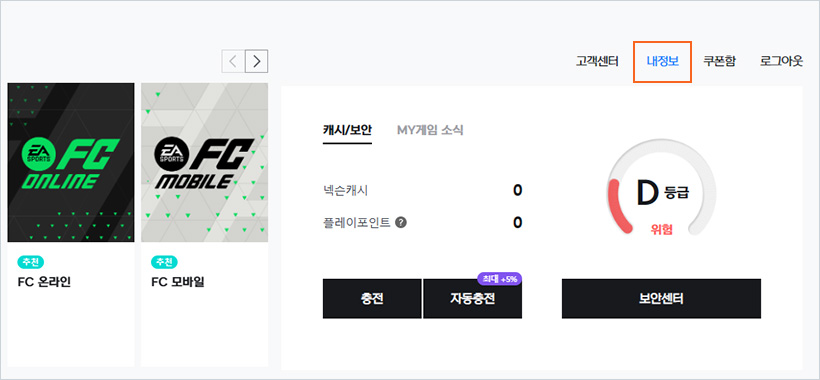 하나. 게임사 홈페이지에 접속한 후 [내정보]를 클릭합니다.