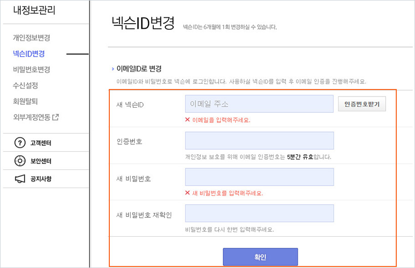 넷. 변경할 이메일 주소를 입력하고, 해당 메일로 받은 인증 번호와 새 비밀번호를 입력한 후 확인 버튼을 클릭하시면 아이디 변경이 완료됩니다.