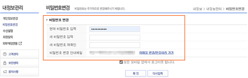 둘. 좌측의 비밀번호 변경을 클릭한 후, 로그인 비밀번호를 한번 더 입력하여 본인확인을 진행합니다.