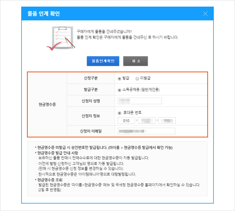 현금영수증 정보를 확인 후