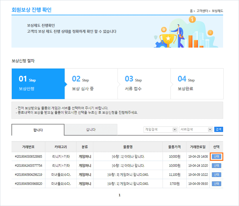 둘. 보상받으실 물품의 게임과 서버를 확인 후 [선택] 버튼을 클릭 합니다.