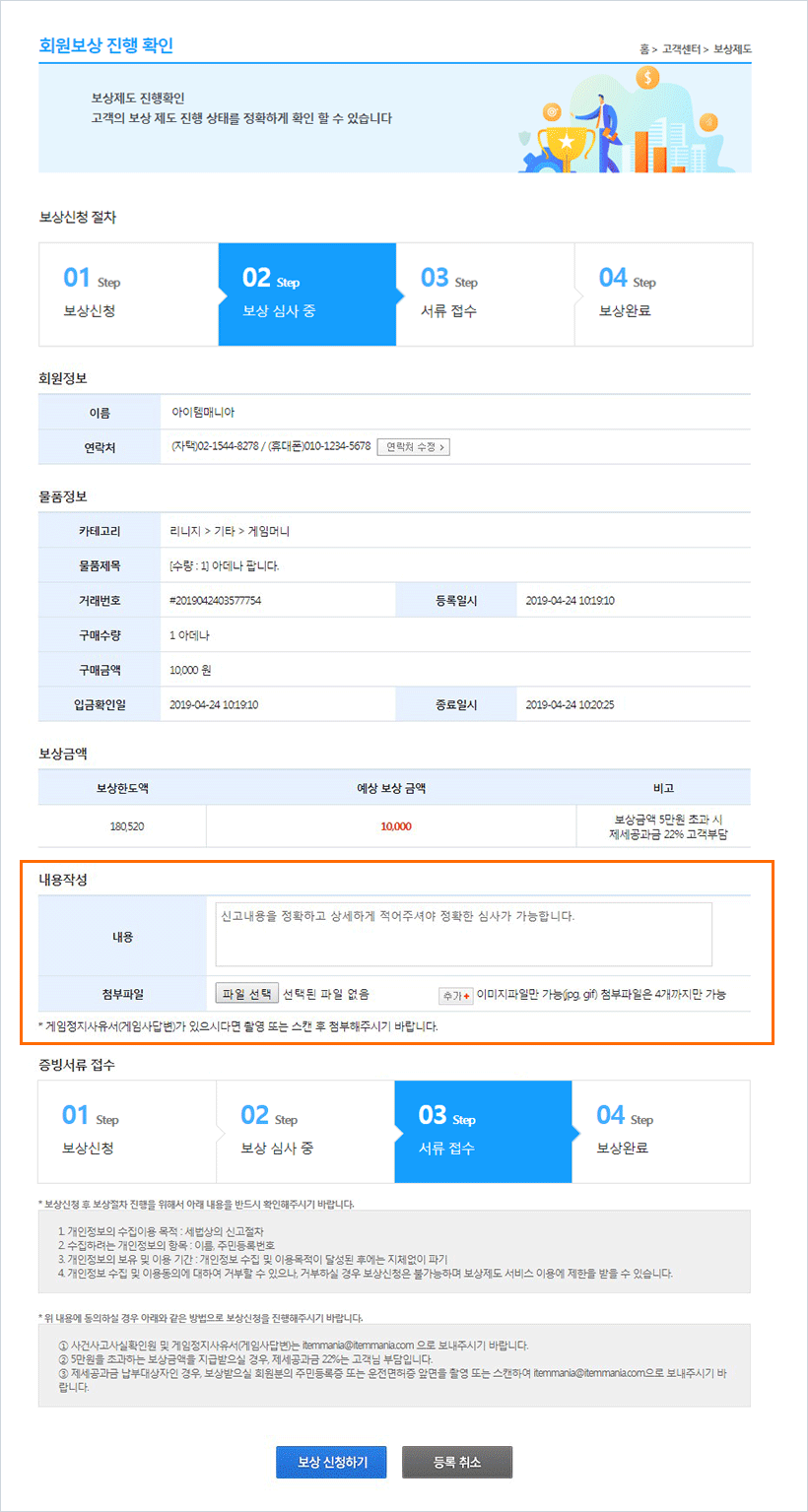 셋. 보상 신청 내용 작성한 후 증빙서류를 첨부하여 [보상신청하기] 버튼을 클릭하면 보상신청이 완료됩니다.