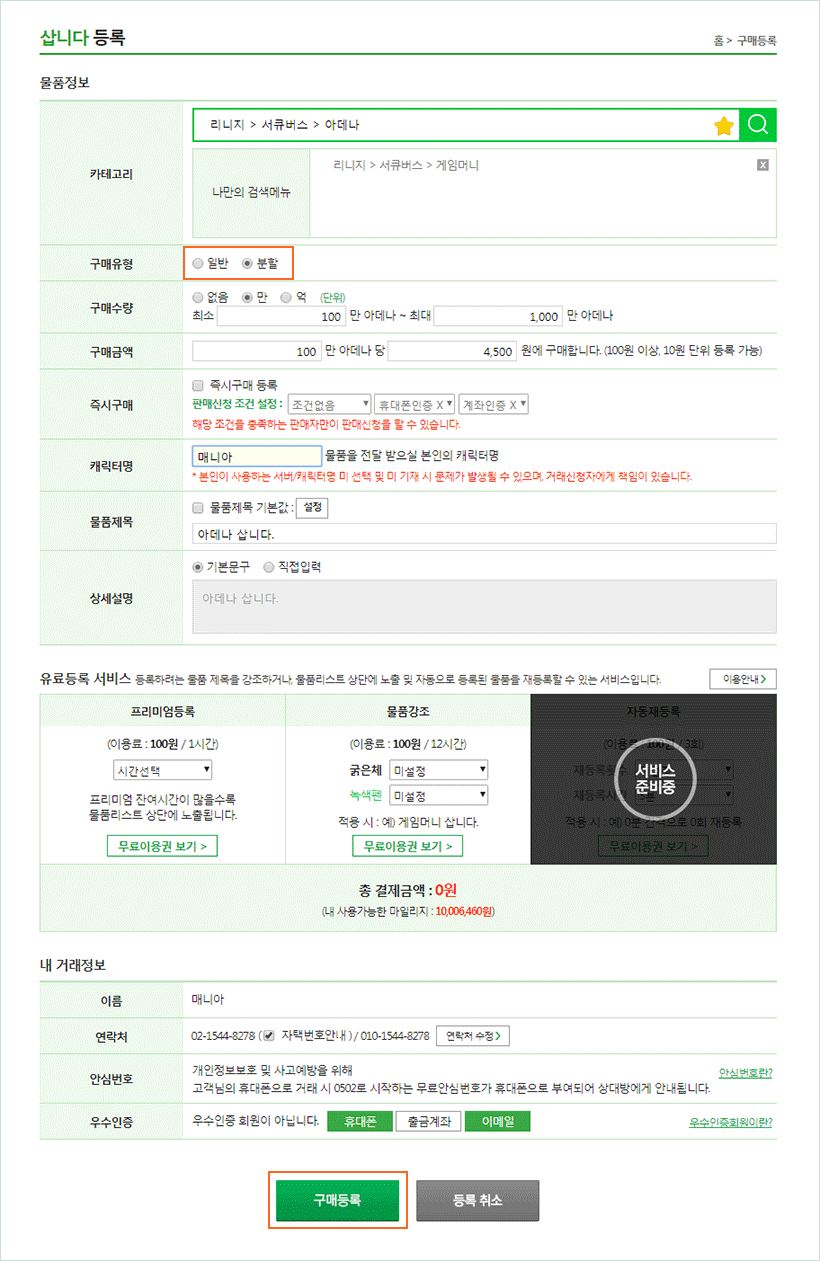 분할거래는 분할판매와 분할구매로 나뉘며, 게임머니, 아이템, 기타 등 모든 물품의 거래가 가능합니다.