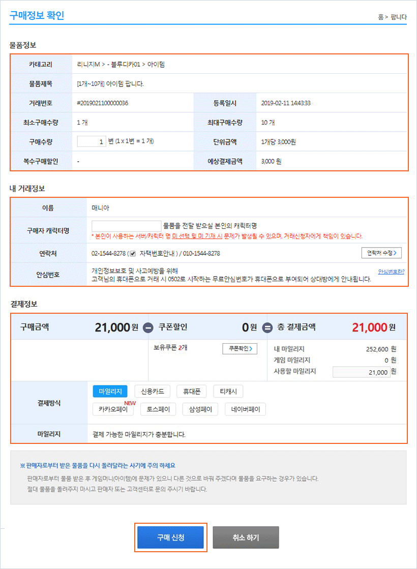셋. 구매정보 확인페이지에서 물품정보 확인, 개인정보 입력, 결제정보 선택 하신 후 [구매신청] 버튼을 클릭합니다.