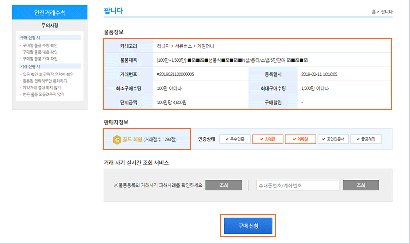 둘. 주문상품 정보에서 구매수량, 예상결제 금액 및 판매자의 신용도를 확인하신 후 [구매신청] 버튼을 클릭합니다.