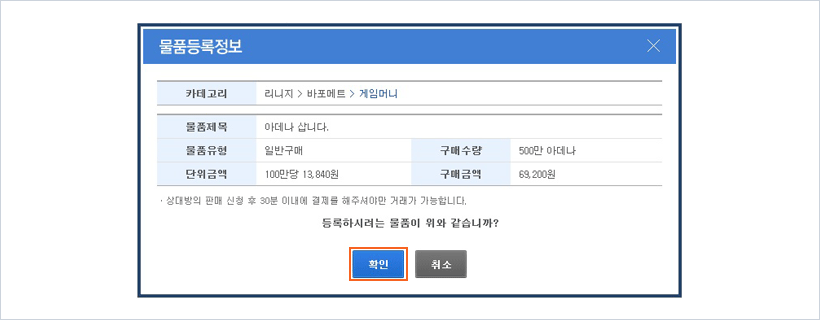 셋. 마지막으로 등록하시려는 물품을 확인하시고 '확인' 버튼을 클릭하세요.