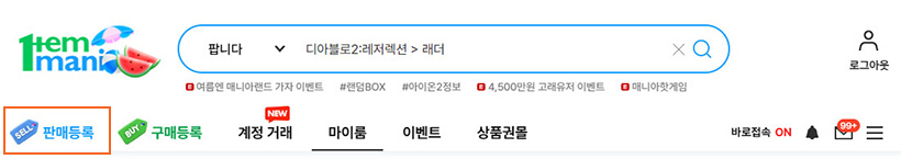 하나. 홈페이지 상단의"판매등록" 메뉴를 클릭합니다.
