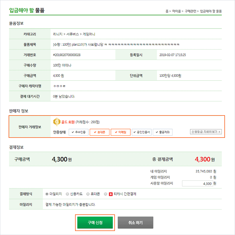 셋. 판매자의 신용도를 확인 및 결제수단을 선택하신 후 [구매신청] 버튼을 클릭합니다.