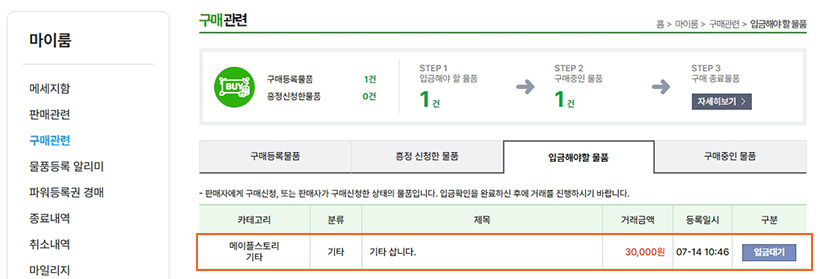 둘. 마이룸>구매관련>입금해야 할 물품에서 입금할 물품을 선택합니다.