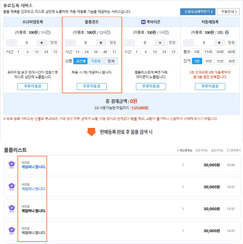 * 물품강조등록은 각각 100원이며 마일리지를 보유하고 있는 경우에만 등록 가능합니다.