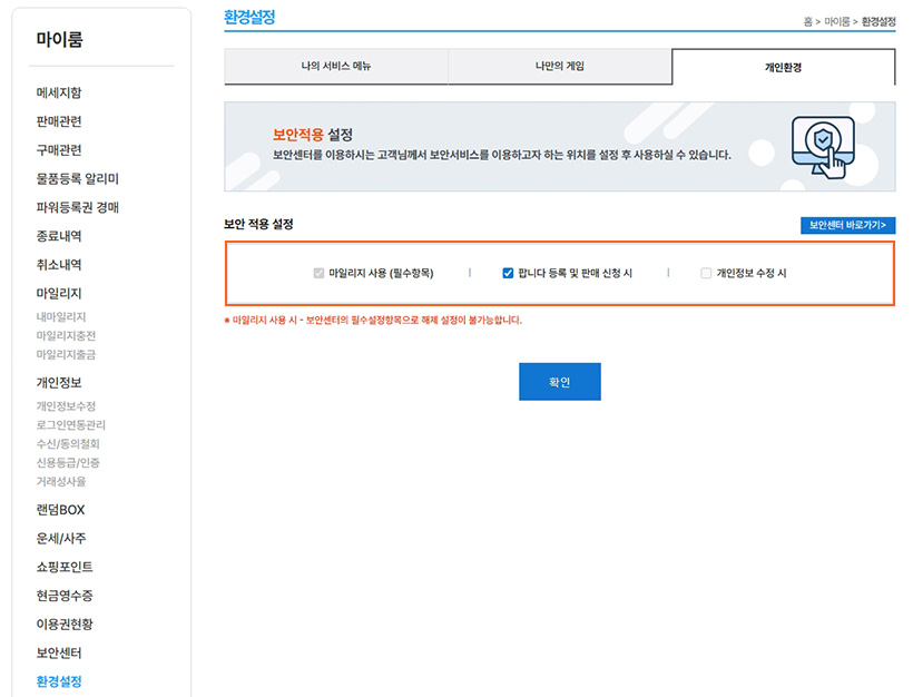 마이룸>사용자 환경설정>개인환경에서 결제 보안 서비스 이용 부분 설정